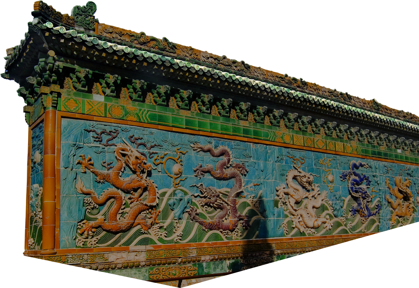 北海公园九龙壁始建于清乾隆二十一年(1756年),是一座双面立体、全琉璃影壁。在明、清两代三大九龙壁中,只有北海公园九龙壁为双面。九龙壁两侧侧立面分别雕有日和月,一面为日,一面为月,寓意与天地同在,与日月同辉,江山永固。整个九龙壁运用红黄蓝白青绿紫七色,双面18条高浮雕巨龙衬以云水,如倒海翻江、栩栩如生。艳丽的色彩经过阳光反射,确乎能看到龙身在缓缓游动,足见琉璃烧造技艺的炉火纯青。